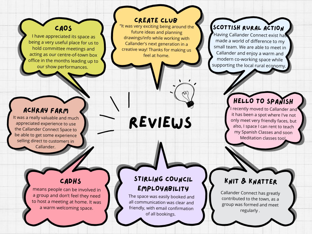 We provide neutral, accessible space for the local authority, the planning authority and community organisations and voluntary groups to collaborate. From flood resilience planning to local consultations, our hub has become a trusted venue for conversations that shape Callander’s future.