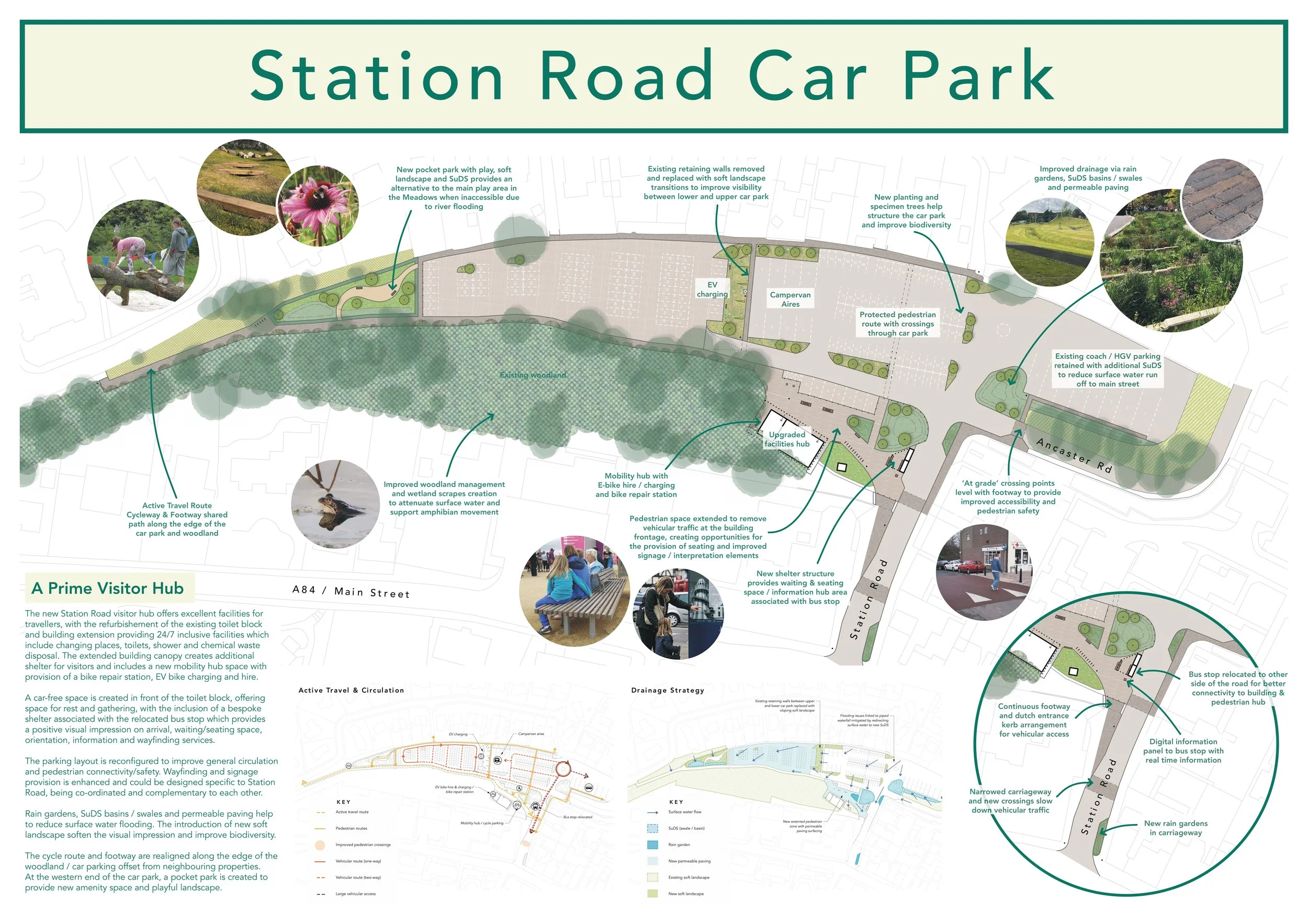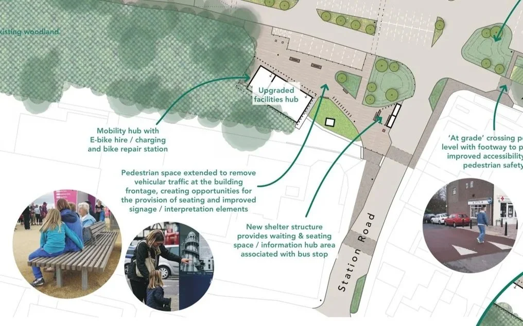 From December 2025-March 2026, a further design study was commissioned with help from Loch Lomond & Trossachs National Park Authority’s Place Programme Fund, to develop the initial vision set out in the Green Adventure Gateway project for Station Road car park. The aims of this were to flesh out more detail in how this site could be come a sustainable travel and mobility hub, focusing on enhanced visitor arrival experience, upgraded active travel routes and bus infrastructure, dedicated motorhome facilities and improved walking & wheeling signage.